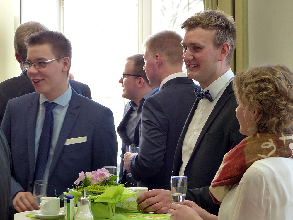 Eltern, Geschwister und Freunde kamen zur Feierstunde, die mit einem lockeren Empfang bei Kaffee und Kuchen begann. In festlichen Anzügen und Kleidern boten die 19 Teilnehmenden einen ganz ungewohnten, aber stilsicheren Anblick. Direktor Uwe Wischkony berichtete in seiner Begrüßung von einer sehr intensiven Zeit für das ganze Haus. Johannes Potthast ermutigte in seiner Festansprache die jungen Leute, mutig ihren Weg zu gehen, dabei das Gespräch mit der älteren Generation nicht zu vernachlässigen und bei Schwierigkeiten den Kopf nicht in den Sand zu stecken, sondern Hilfe zu suchen.